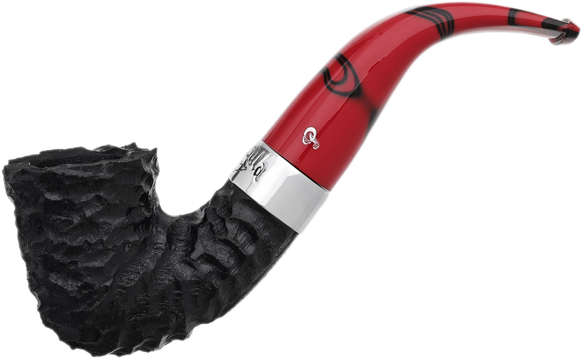 Drawing inspiration from Bram Stoker's Dracula, Peterson's eponymous series dresses pipes in a macabre aesthetic that combines a cauldron-black stain with a blood-red acrylic stem swirling with inky tendrils — each separated by a broad nickel band. Spooky and distinctive, the Dracula series is among the Irish marque's most colorful and recognizable, as represented by this rusticated 05 Bent Dublin model.