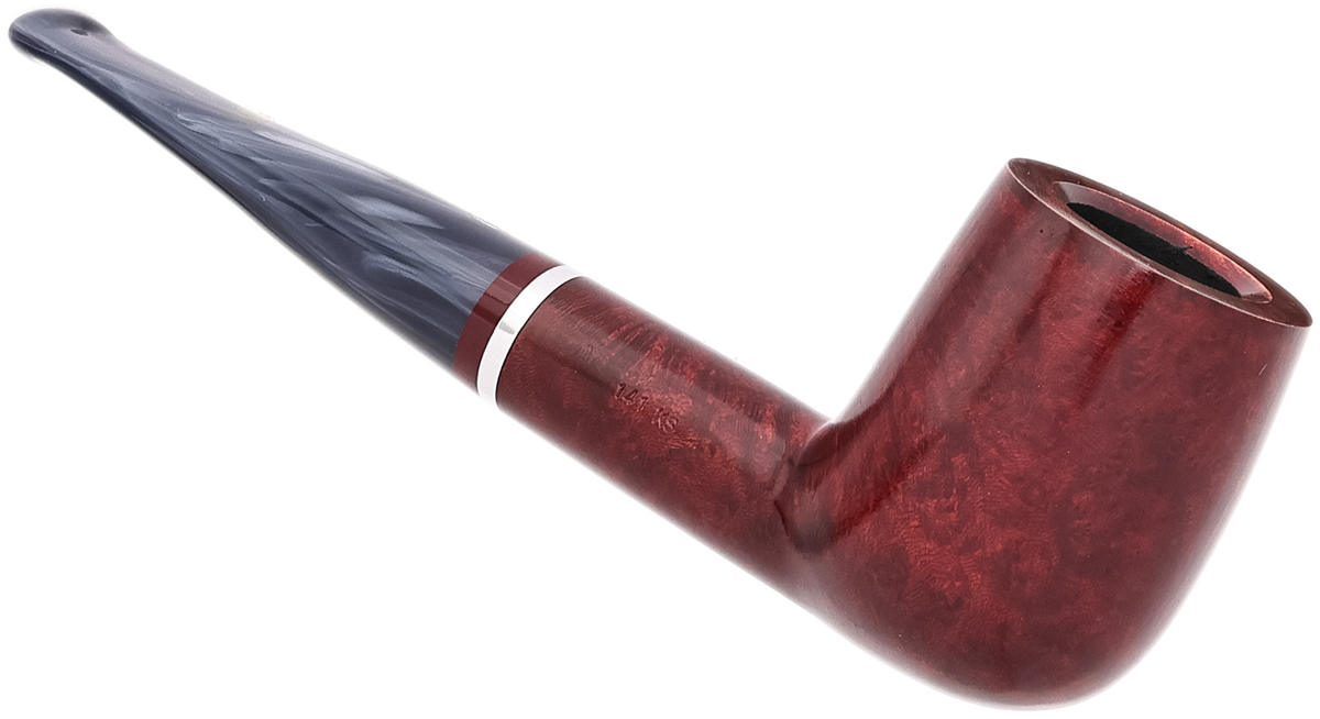 The Lunaria series is offered in two Bordeaux-hued finishes — smooth and rusticated. Each pipe is fitted with a swirled gray methacrylate stem and accented by an aluminum band. The line comprises five shapes, with the smooth 141 KS presented here.