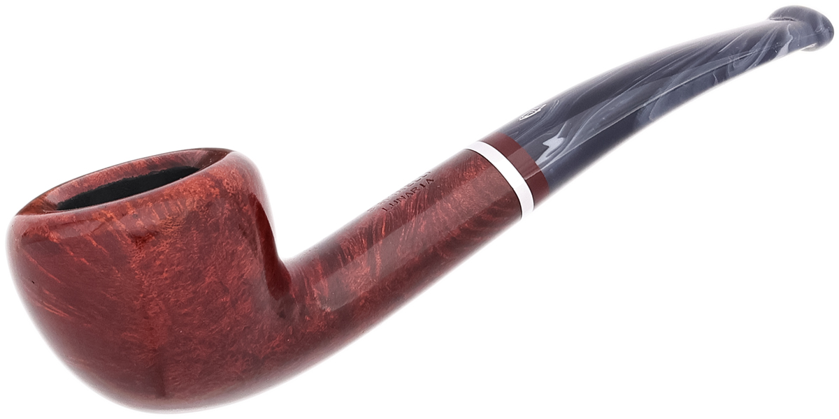 The Lunaria series is offered in two Bordeaux-hued finishes — smooth and rusticated. Each pipe is fitted with a swirled gray methacrylate stem and accented by an aluminum band. The line comprises five shapes, with the smooth 316 KS presented here.