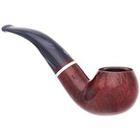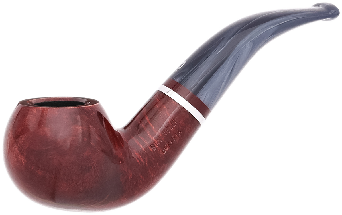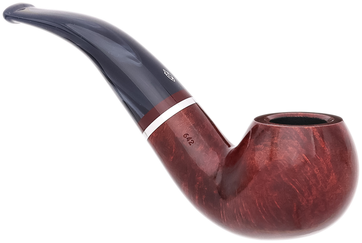 The Lunaria series is offered in two Bordeaux-hued finishes — smooth and rusticated. Each pipe is fitted with a swirled gray methacrylate stem and accented by an aluminum band. The line comprises five shapes, with the smooth 642 presented here.
