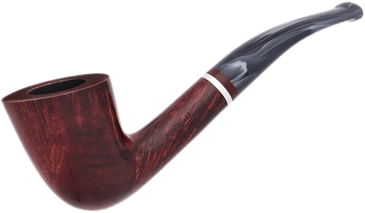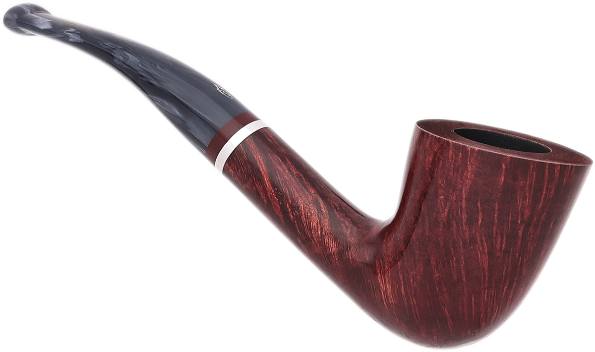 The Lunaria series is offered in two Bordeaux-hued finishes — smooth and rusticated. Each pipe is fitted with a swirled gray methacrylate stem and accented by an aluminum band. The line comprises five shapes, with the smooth 920 KS presented here.