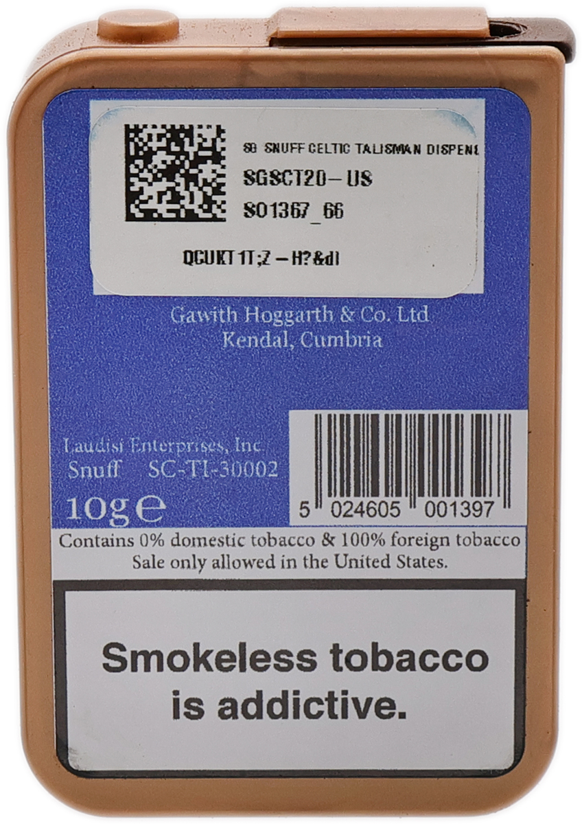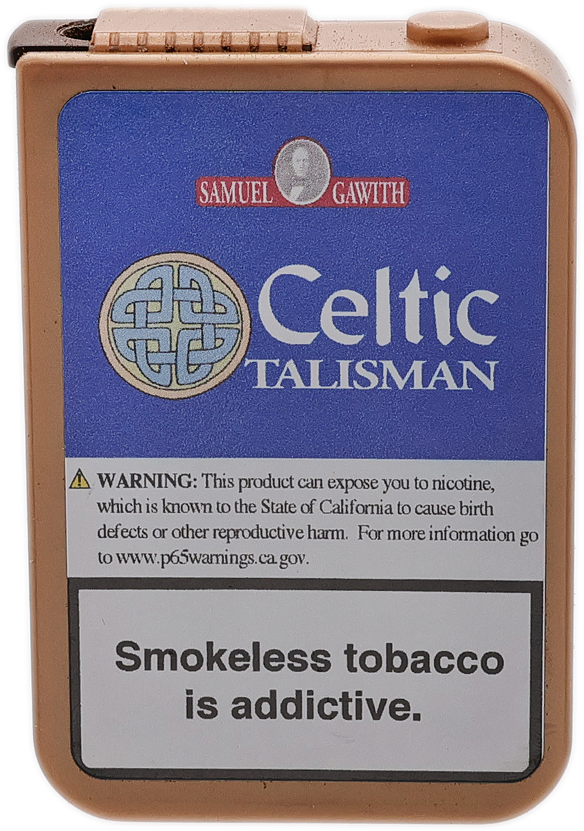 Founded in 1792, The House of Samuel Gawith has remained a leader in premium nasal snuffs for over two centuries. Among the brand's most popular blends, Celtic Talisman is a light brown, finely milled nasal snuff with notes of ripe Kirsch cherries.